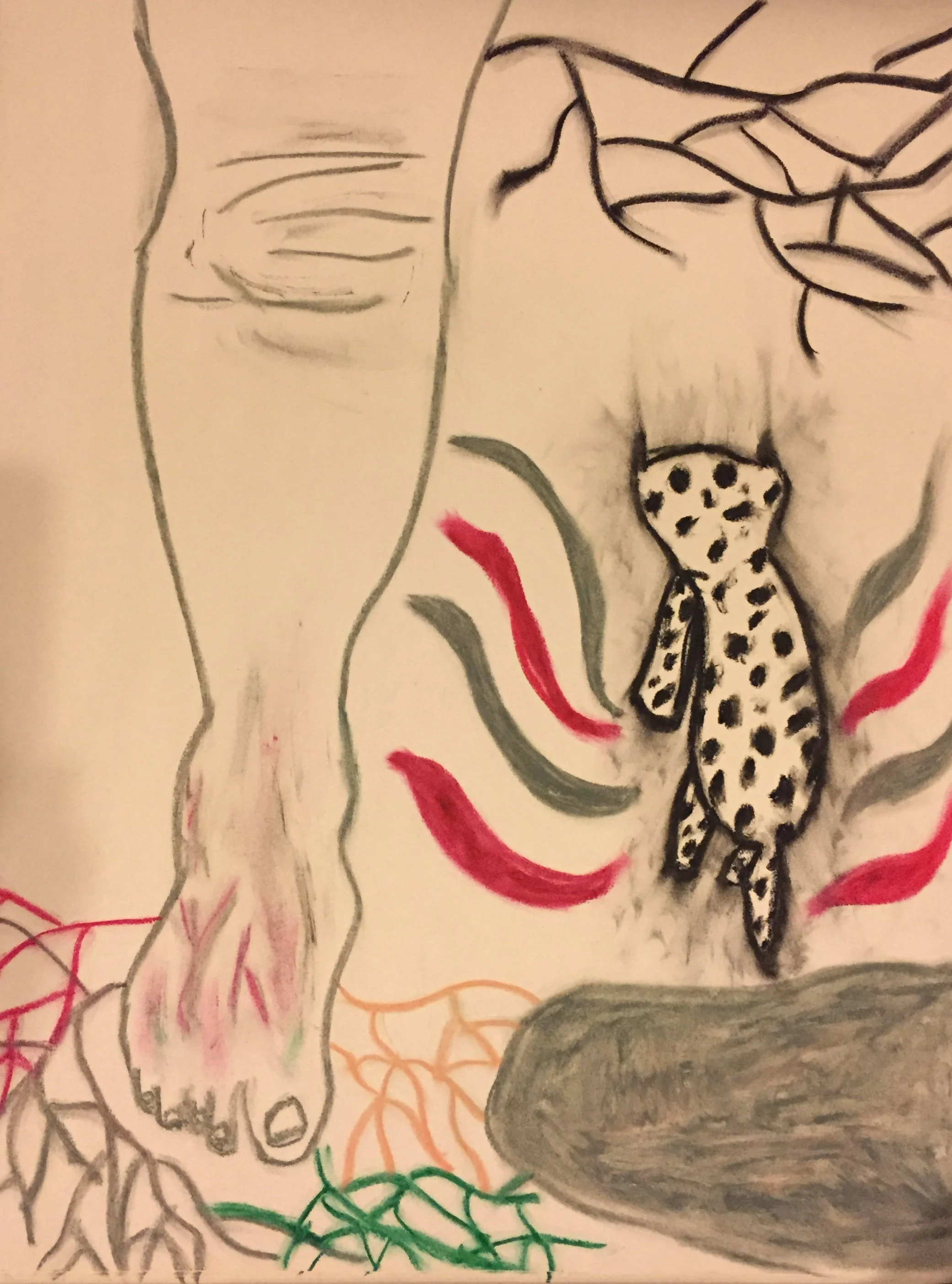 The lesson I’ve taught myself at the present moment is a message contained within my old drawings—my power is in my legs and feet. My power animal may have first appeared to me by bursting forth from my chest, but she walks with my legs and feet. And when I’m connecting to them, she comes to me. Right now, I’m connected, but I wasn’t always. I spent 32 years being dissociated and disconnected from my whole body. My legs and feet were the last body part I was able to feel. I used to complain to one of mentors and teachers that I couldn’t feel my legs and feet, and by that point, I could feel everything else. Around this time of mid-August six years ago in 2016, I was molested by a woman I used to love, admire, and think of as a kind of teacher, and through the Fall, I was dramatically dropped by another woman I loved who was my teacher, and then I removed myself from the entire friend group and community I belonged to. Every year, I feel it. It was around this time in 2017, I began to start getting some feeling in my legs and feet.